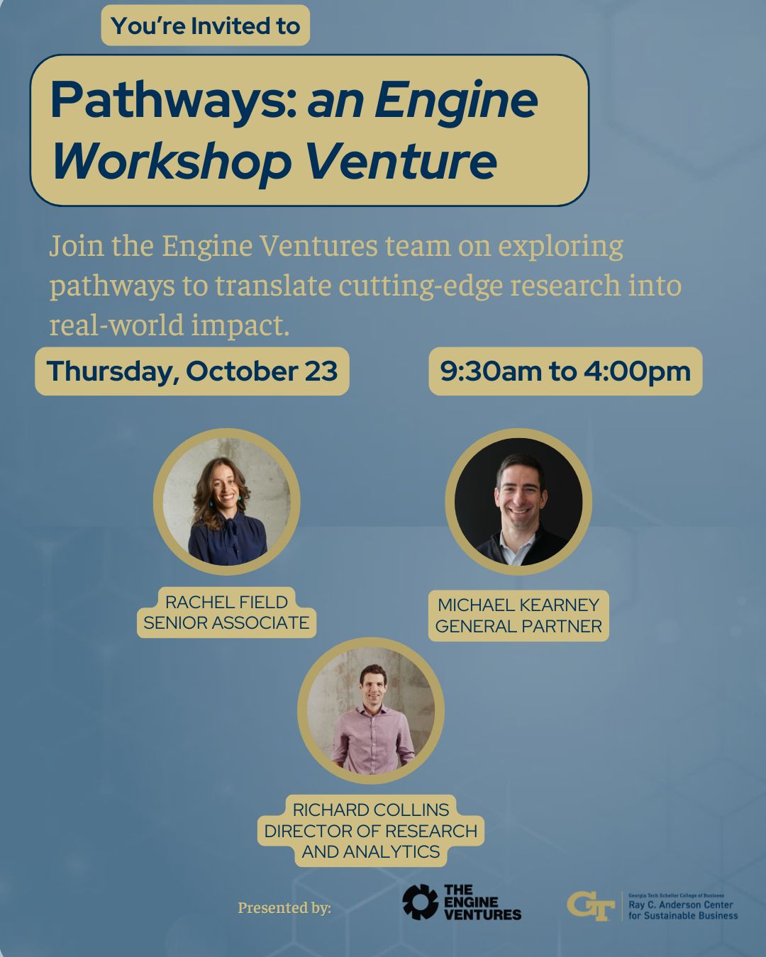 SUSTAIN-X is partnering with The Engine Ventures to sponsor a one-day workshop Georgia Tech founders and prospective founders working in groundbreaking tech (or “deep tech”) space. The Engine Ventures, is a nonprofit incubator and accelerator dedicated to providing early-stage tough tech companies with the critical infrastructure, programs, and ecosystem they need to thrive. The workshop will address the challenges of bringing deep tech to market. Workshop leaders will help founders explore the commercial potential of transformative, or "tough tech" technologies. By the end of the day, participants will have acquired a basic framework to assess whether and when to take the step from academic research to commercialization. The event offers a unique opportunity to connect, learn, and make progress towards business ideas that offer solutions to some of the world’s most pressing challenges.