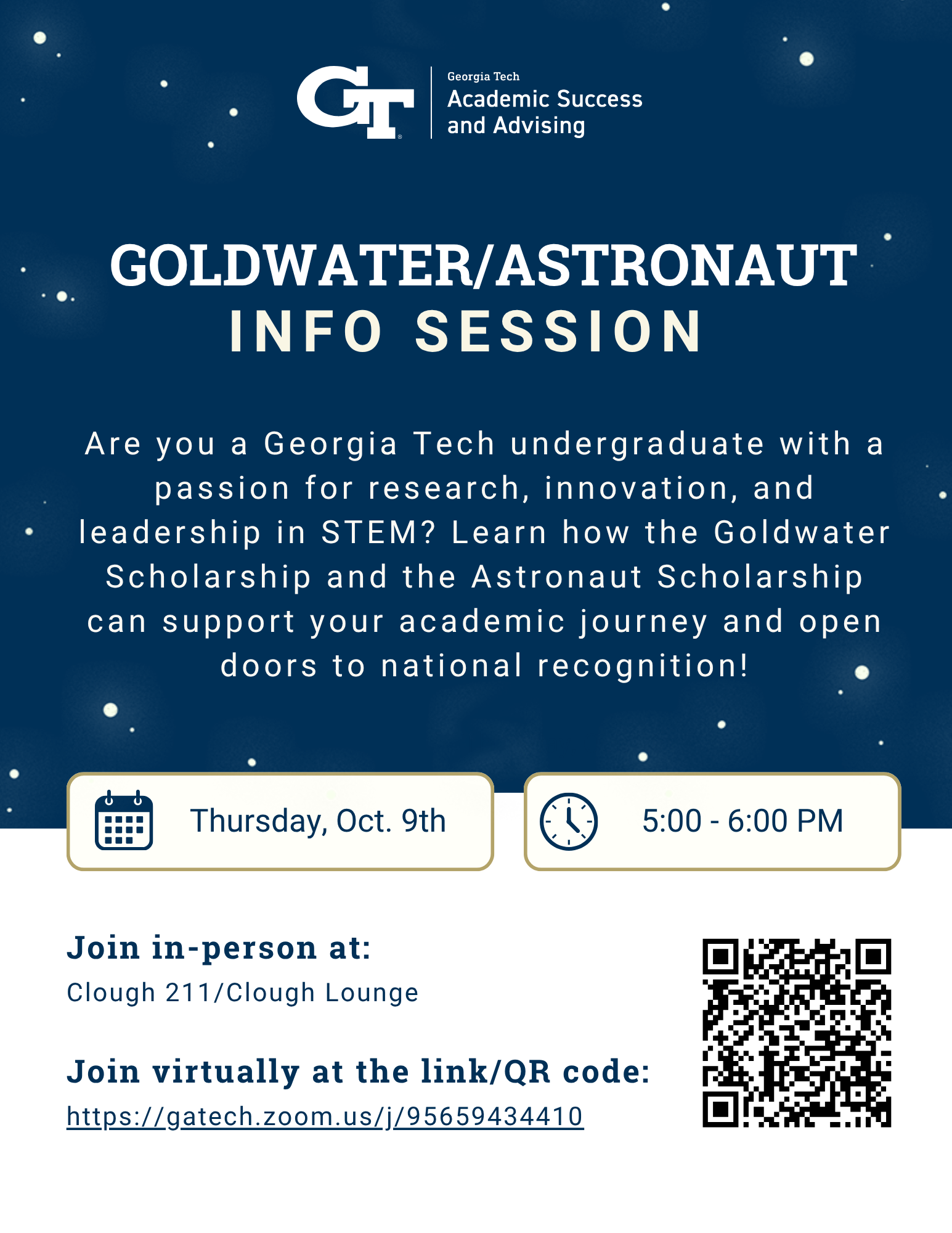 Are you a Georgia Tech undergraduate with a passion for research, innovation, and leadership in STEM? Learn how the Goldwater Scholarship and the Astronaut Scholarship can support your academic journey and open doors to national recognition! All Events Thursday October 9 Location Clough 211/Clough Lounge 5:00PM - 6:00PM Location URL Related Link Categories Event categories Workshop