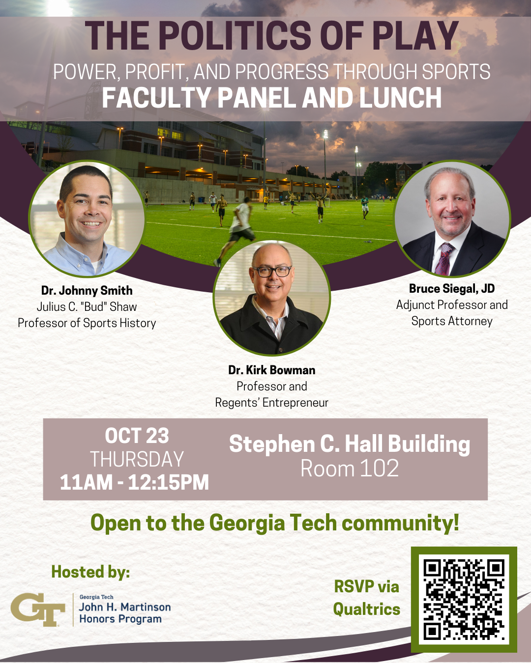 Join three Georgia Tech faculty as they talk about the history of sports, sports politics, and sports law on a panel hosted by the John H. Martinson Honors Program. The panel will be on Thursday, October 23rd, 2025 from 11am-12:15pm in Stephen C. Hall room 102.